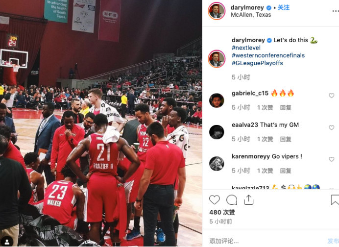 火箭高歌猛进的时候,发展联盟的毒蛇队也表现不俗。今天的比赛,里奥格兰德河谷毒蛇队战胜了圣克鲁兹勇士,进入到了发展联盟的总决赛,在现场,火箭主帅莫雷见证了球队的晋级。在社交媒体上,莫雷还晒出了一张现场的照片,然后写道,“让我们去拼搏吧,下一级别,发展联盟季后赛。”