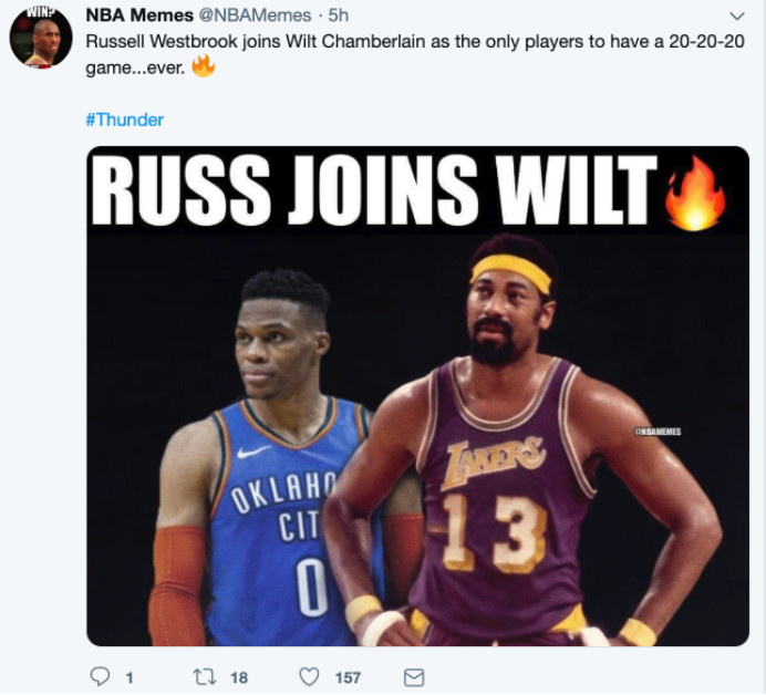 很多人都调侃韦斯布鲁克是数据刷,但这样历史级别的数据,一般人可能还真的刷不出来。看到韦斯布鲁克如此惊人的表现,麦科勒姆就写道,“他真的拿到20+20+20的数据,这真的是太疯狂了。”