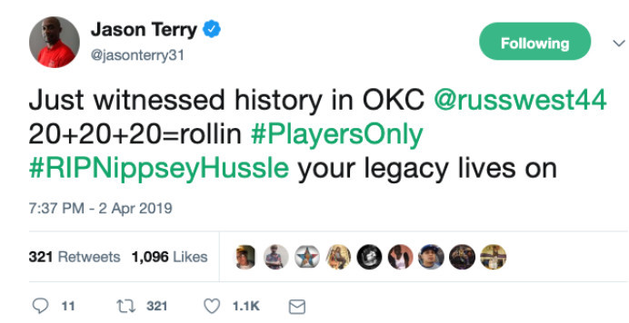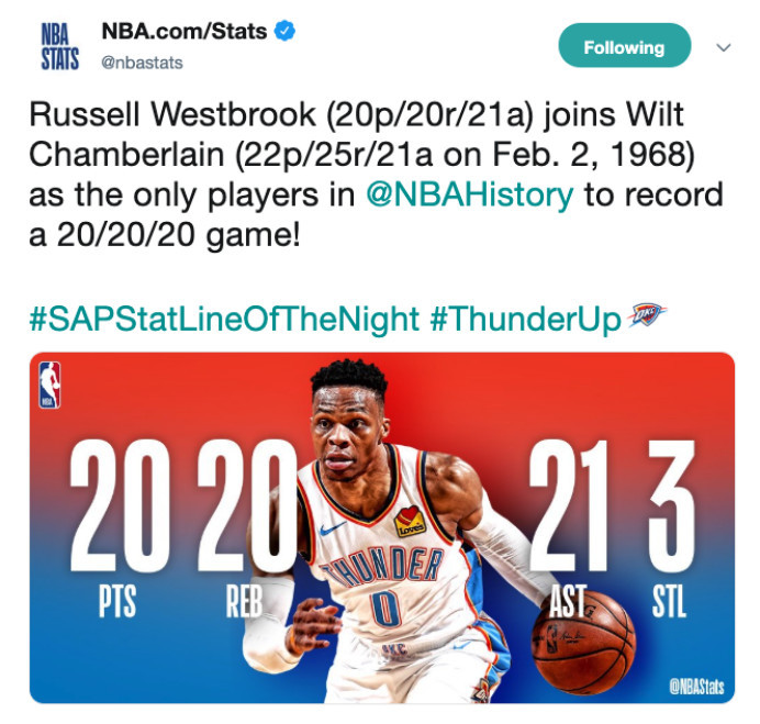 前NBA球星贾森-特里在社交媒体上表示,“刚刚在俄克拉荷马见证了韦斯布鲁克的20+20+20数据,你的传奇还在继续。”