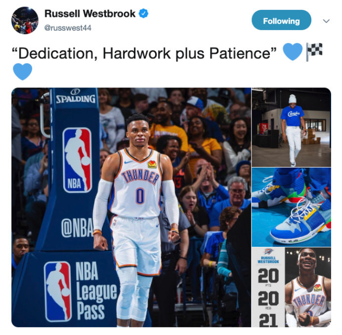 这样的里程碑之夜结束之后,韦斯布鲁克更新社交媒体,晒出了自己今天的一些照片,然后写道,“奉献、努力加上耐心。”