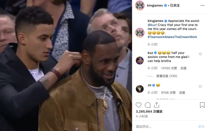 虽然对阵雷霆的比赛,詹姆斯并没有出战,但在场边的他依然是媒体、球迷们关注的焦点,在社交媒体上,詹姆斯晒出了一段库兹马为自己在场边戴项链的画面,然后写道,“感谢库兹马的助攻,很疯狂,这个赛季你给我的第一次助攻竟然是来自于场边。”随后库兹马回应称,“你的一半助攻都来自于我,很高兴能够帮助到你,兄弟。”