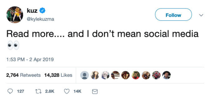 湖人球星库兹马是一个非常潮的人,今天在社交媒体上,库兹马呼吁,“多去阅读,我的意思不是社交媒体。”看到这条推特之后,多诺万-米切尔回应称,“如果我是在手机上读书呢?”紧接着,库兹马回应称,“你好米切尔,需要澄清的是,因为那不是在社交媒体的软件上读书的,那应该被称为是电子书。”
