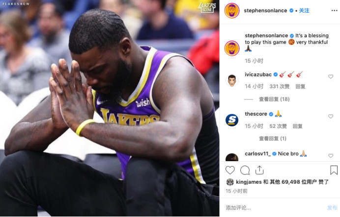 对阵雷霆的比赛,兰斯-史蒂芬森首发出战,全场他6投3中,三分球5投3中,得到了9分3助攻的数据。比赛开始之前,史蒂芬森晒出了一张自己在场边的照片,然后写道,“非常幸运能够去打这比赛,非常的感恩。”不知道,未来史蒂芬森能不能继续留在湖人。
