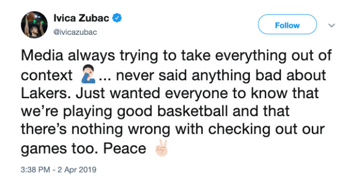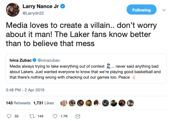 随后小南斯转发了祖巴茨的社交媒体,然后写道,“媒体总是喜欢制造坏人形象,不要在乎这个兄弟。湖人的球迷们是不会相信这个的。”