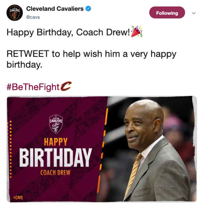 与此同时,今天也是骑士主帅拉里-德鲁61岁的生日,在社交媒体上,骑士官方也发文,祝贺德鲁教练生日快乐。