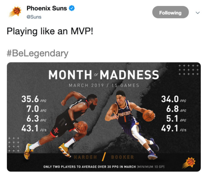 这个赛季,哈登状态爆表,大家已经习以为常,而进入到三月份之后,德文-布克也有着非常不错的数据。今天,太阳官方晒出了哈登和布克三月份的数据对比照片,在此期间,哈登场均得到35.6分7个助攻6.3次篮板,投篮命中率为43.1%,而布克在此期间,场均可以得到34分6.8个助攻5.1篮板,投篮命中率为49.1%。“像MVP一样打球,”太阳队写道。