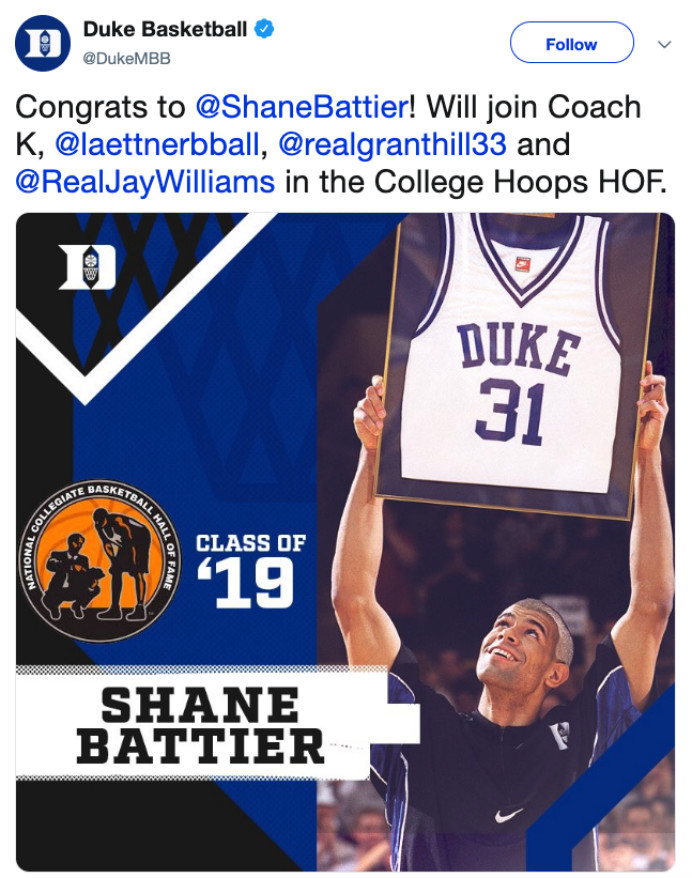 虽然NBA生涯场均只能得到8.6分,但不得不说,不管在哪支球队,肖恩-巴蒂尔都是一名受尊敬的球员。今天,肖恩-巴蒂尔入选了2019年全美大学篮球名人堂。在社交媒体上,杜克大学官方也发文,祝贺巴蒂尔。“恭喜巴蒂尔,他将会成为老K教练、莱特纳、格兰特-希尔、贾森-威廉姆斯之后,又一个加入大学篮球名人堂的球员。”