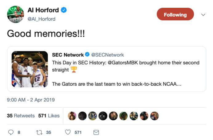 对于很多NBA球员来说,大学的经历,他们可能一辈子都无法忘记。今天在社交媒体上,有媒体晒出了一张2007年,佛罗里达大学击败俄亥俄大学,连续第二年拿到NCAA总冠军的照片,随后,霍福德转发了这张照片,然后写道,“非常好的回忆。”