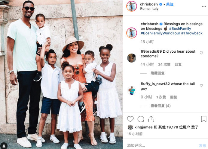 退役之后的克里斯-波什,日子过得依然潇洒,今天在社交媒体上,波什晒出了自己和家人们的合影,波什一家前往了罗马旅行。