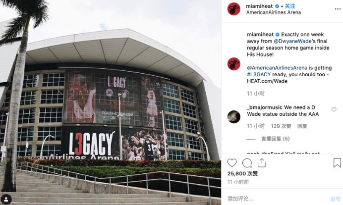 波什已经退役,而他的老队友韦德也不远了。如果热火最终无缘季后赛,北京时间4月10日,热火对阵76人的比赛,就将韦德职业生涯最后一次在热火主场打球了,今天在社交媒体上,热火官方也晒出了美航中心球馆之外,为韦德准备的这样一张大海报,然后写道,“距离韦德最后一个常规赛主场比赛,还有一周的时间。”