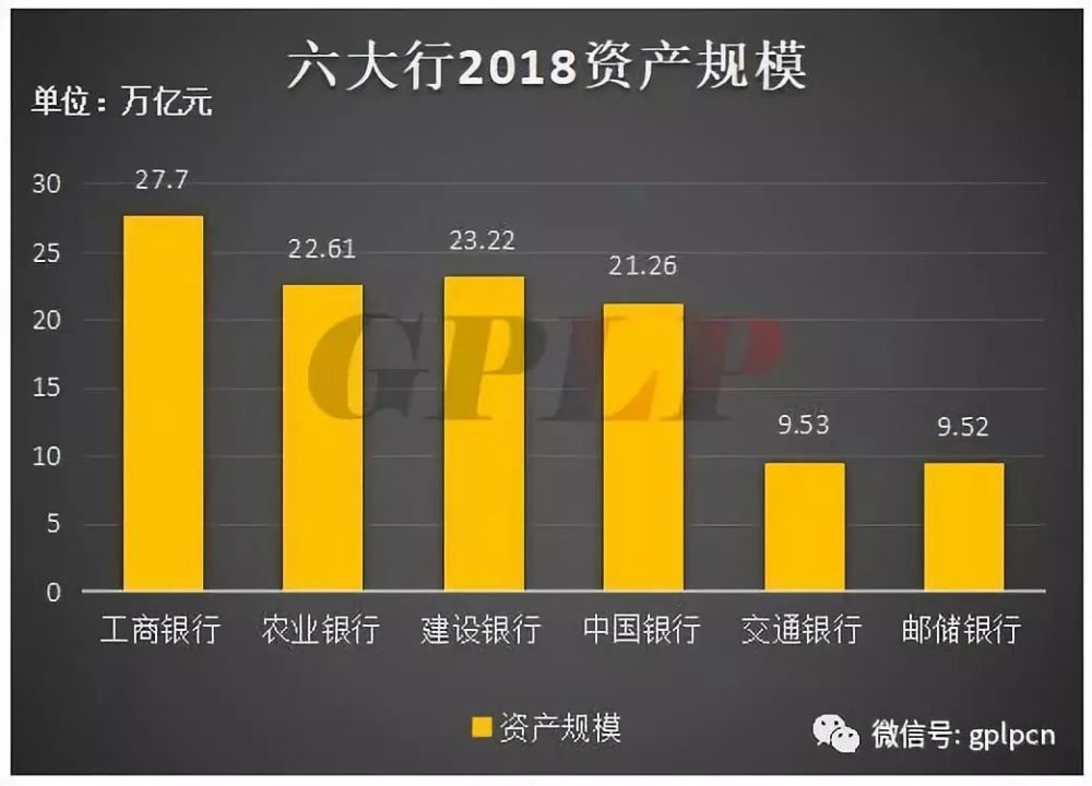 年报显示,2018年六大行均保持了较高的资产增速,工行、建行、农行、中行、交行和邮储银行的资产规模分别达到27.7万亿、23.22万亿、22.61万亿、21.26万亿、9.53万亿、9.52万亿。