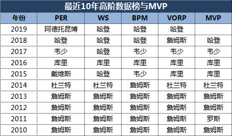 上表是最近10年高阶数据榜四大项目排名第一的情况以及该年MVP最终归属(2019年MVP尚未选出),我们首先要感叹一下,詹姆斯无愧划时代超巨,在这份榜单2010年至2013年期间,他完成了高阶数据四项全榜霸,确实能力非凡。