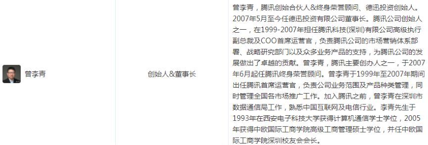 而德迅投资的创始人,正是腾讯的早期五位创始人之一的曾李青。
