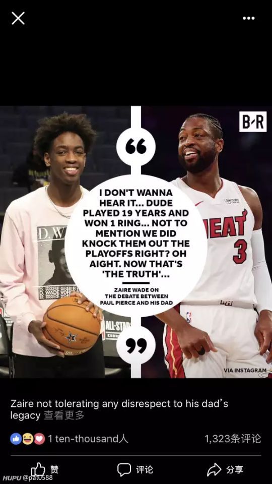 腾讯体育4月7日讯 之前退役名宿保罗-皮尔斯在节目中称自己职业生涯比韦德要出色,德维恩-韦德儿子扎伊尔也在推特上嘲讽了皮尔斯。【NBA专题】