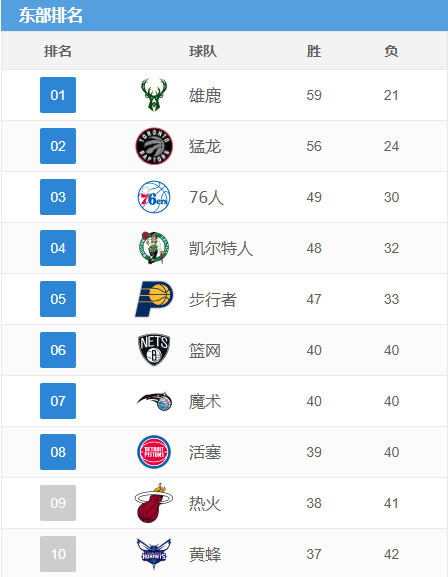 东部目前排名为雄鹿第一(59胜21负)、猛龙第二(56胜24负)、76人第三(50胜30负)、凯尔特人第四(48胜32负)、步行者第五(47胜33负)、篮网第六(40胜40负)、魔术第七(40胜40负)、活塞第八(39胜40负)、热火第九(38胜41负)、黄蜂第十(37胜42负)。