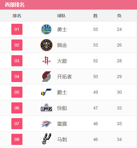 西部目前排名为勇士第一(55胜24负)、掘金第二(53胜26负)、火箭第三(52胜28负)、开拓者第四(50胜29负)、爵士第五(49胜30负)、快船第六(47胜33负)、雷霆第七(46胜33负)、马刺第八(46胜34负)。(立春)