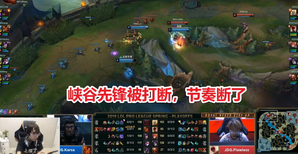 而这场BO5最关键的就是决胜局的那一场了,不过RNG从开局之后不久就陷入了巨大劣势,主要的原因就是Uzi在上线的时候被抓,导致了下路必须karsa常驻才能挽回劣势,这样的结果就是对面上路这个天使在前期发育太肥,成为了中后期RNG最大的隐患,当然RNG也并不是没有机会拿下比赛,mlxg在昨天自己复盘这场决胜局时也是进行了犀利的的点评。