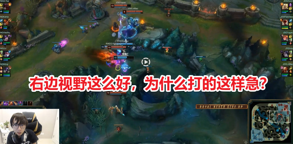 JDG在野区中野给了波机会,让RNG拿到了大龙,不然这把慢性死亡,翻盘点是找到了,但是后面天使、卡莎绕后把我看傻了。
