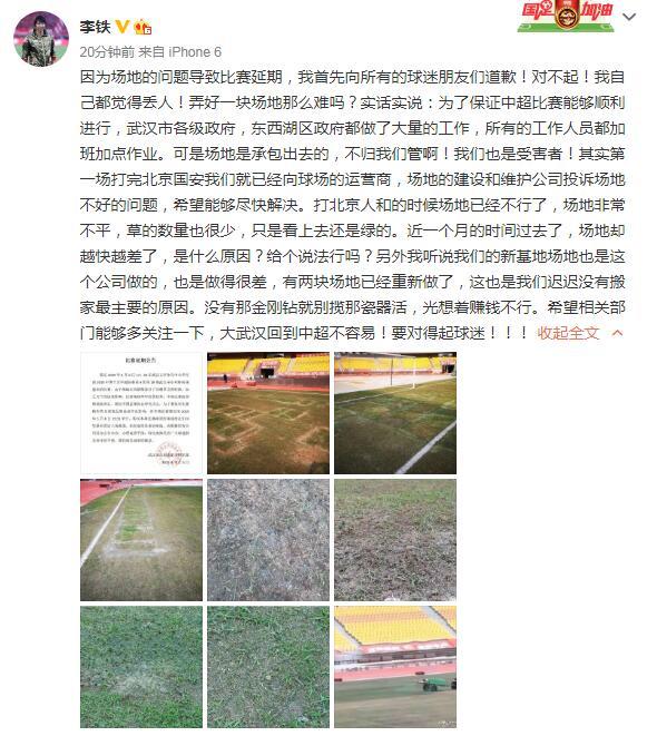 腾讯体育4月6日讯 按照中超赛程,武汉卓尔将在今日下午迎战河南建业。但因场地问题,比赛被迫延期。卓尔主帅李铁在自己的社交媒体上痛斥场场地供应商不能只想着赚钱,并称因场地问题延期自己都觉得丢人。 【中超专题】