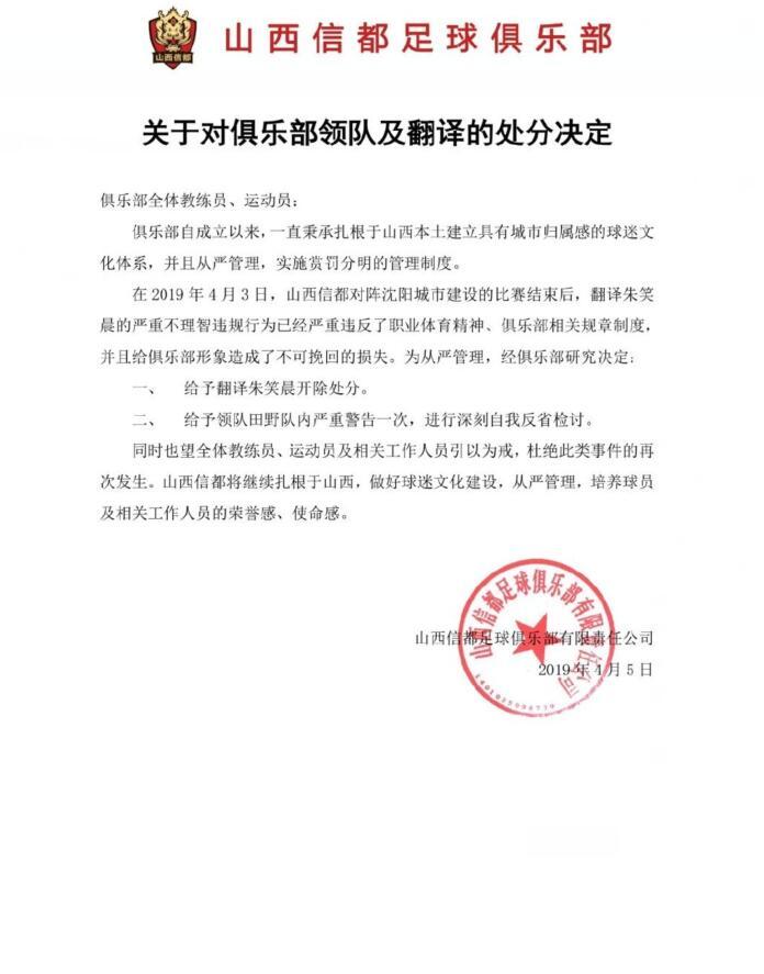 山西信都俱乐部也在近日对两人进行了处罚,给予翻译朱笑晨开除处分,给予领队田野队内严重警告一一次。