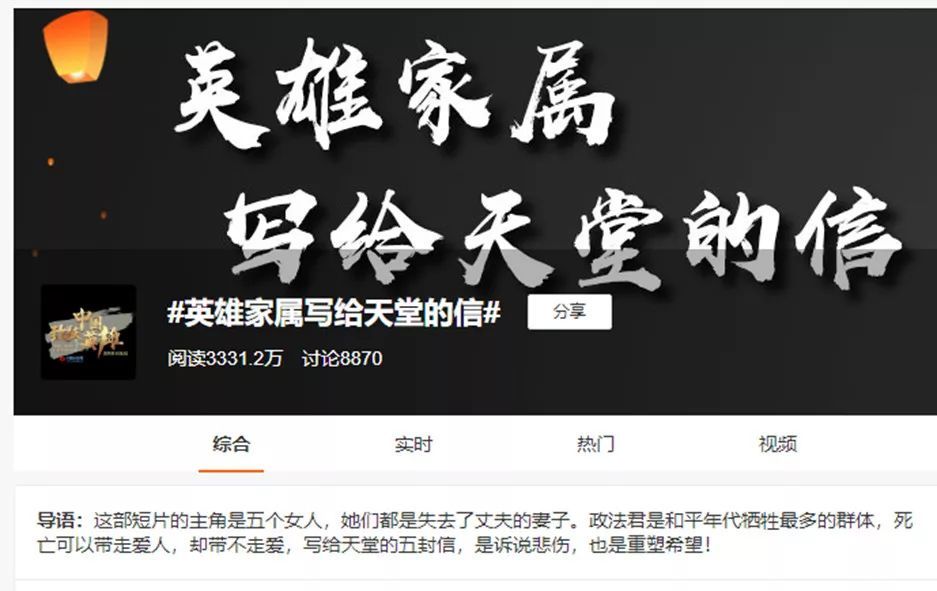 在新浪微博上,3300多万网友聚集在#英雄家属写给天堂的信#话题下,让“天堂的信”成为当天的热搜,网友们共同为英雄哀悼,为生者加油。
