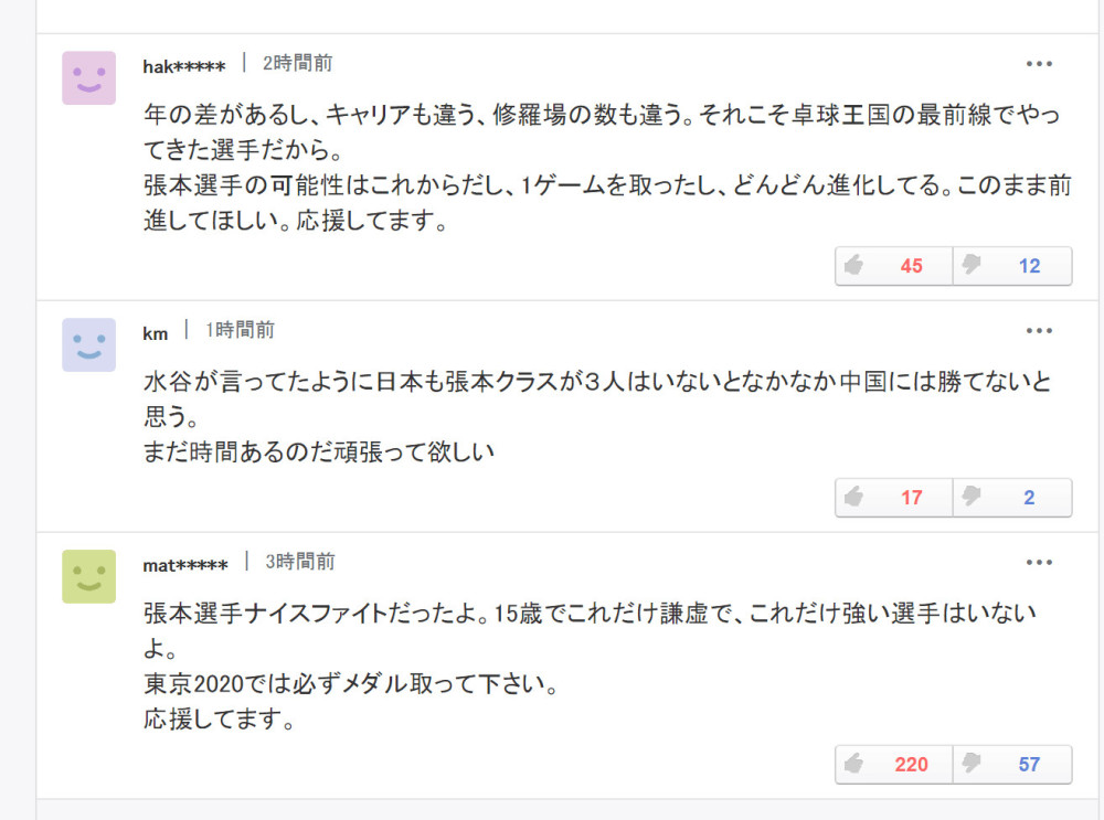 也有人展望东京奥运会,称看好张本智和。“张本选手拼得很顽强。才15岁,就如此谦和,实力如此强大。2020年东京奥运会一定会夺取奖牌!我们为你加油!”