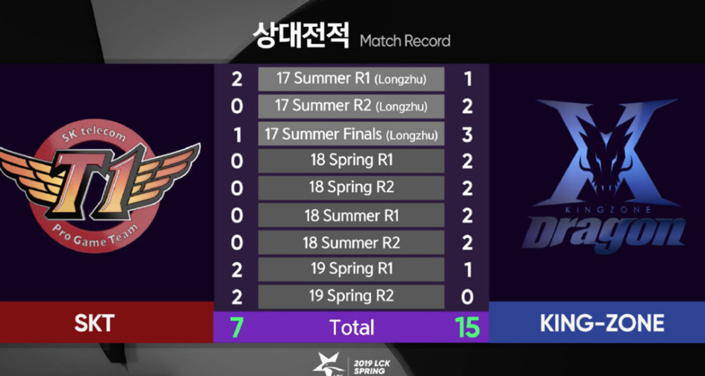 赛前,LCK官方给出了相关数据。从此前两支队伍的对战情况来看,KZ面对SKT时候,胜局明显要多一些。当然,因为双方战队成员,也都进行了比较频繁的变换,所以这项数据也并不能证明什么。但从S9春季常规赛的情况来看,SKT遇到KZ后,胜场明显很多。
