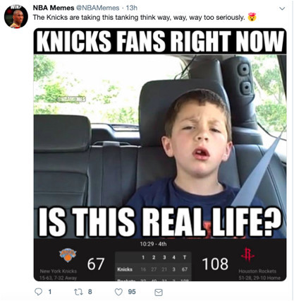 很多球队为了摆烂,都可以算得上是不择手段,比如说赛季后半段的纽约尼克斯队。昨天和火箭队的比赛,第四节刚开始的时候,尼克斯一度落后火箭40多分,不知道看到这样的比赛,尼克斯的球迷们是一种什么样的感受。