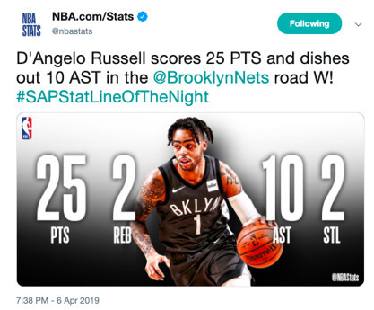 这个赛季的篮网,表现确实让人刮目相看,今天的比赛中,他们战胜了雄鹿。这场比赛,拉塞尔出战33分钟,15投10中,三分球4投3中,得到了25分10助攻,比赛结束之后,NBA官方也将拉塞尔的表现,评选为今日NBA的最佳数据。