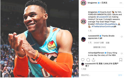 这个赛季,韦少又一次达成场均三双的成就,而看到韦斯布鲁克如此表现,在社交媒体上,勒布朗-詹姆斯也特意发文,表示祝贺,“太棒了兄弟,永垂史册,致敬并且祝贺韦斯布鲁克创造历史,成为历史上第一位连续三个赛季,拿下三双表现的球员。”