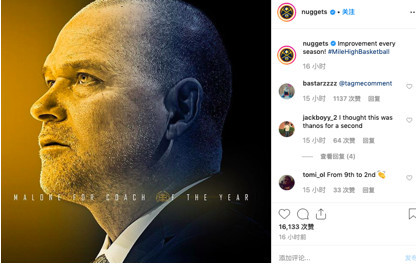 这个赛季,丹佛掘金的进步有目共睹,除了球员们的成长,球队主帅马龙的调教也功不可没。今天在社交媒体上,掘金官方晒出了一张主帅马龙的照片,然后为其在年度最佳主帅的争夺中拉票,配文中写道,“每年都在进步。”