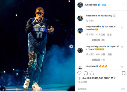 独行侠球星东契奇最近遇到了波多黎各的著名音乐人Bad Bunny,东契奇将一件自己的球衣,送给了这位音乐人。而在社交媒体上,东契奇晒出了Bad Bunny在演唱会上,身穿自己球衣进行表演的画面。