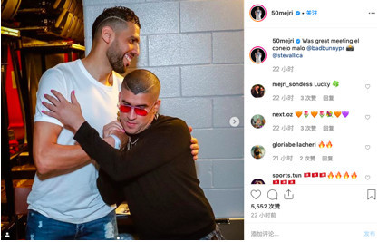 而在社交媒体上,独行侠内线梅杰里,也晒出了一张自己和Bad Bunny拥抱致意的画面。