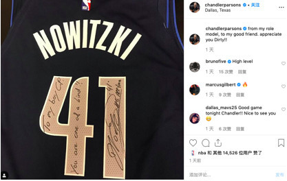 独行侠之前输给了孟菲斯灰熊,这场比赛诺维茨基遇到了自己曾经的队友,钱德勒-帕森斯。比赛结束之后,帕森斯还在社交媒体上,晒出了一件有诺维茨基亲笔签名的球衣。