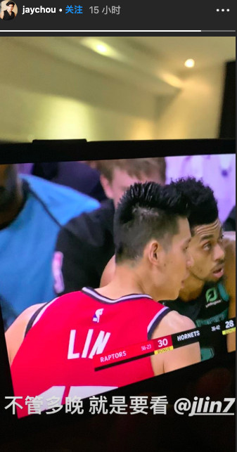 猛龙队上场遗憾输给了黄蜂,这场比赛,林书豪面对旧主表现糟糕,全场出战10分钟,2投0中没有得分。不过著名艺人周杰伦通过电视直播,关注到了林书豪的比赛,在社交媒体上,周杰伦就晒出了一张林书豪在比赛中的照片,然后写道,“不管多晚就是要看林书豪。”