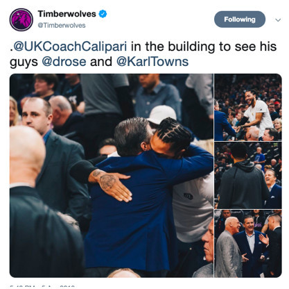 热火上场输给了森林狼,这场比赛,肯塔基主帅卡里帕里也来到了现场观战。在社交媒体上,森林狼官方也晒出了一张卡里帕里和唐斯、罗斯拥抱的画面,这两大球星,都是卡里帕里的弟子。