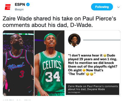 而扎伊尔-韦德也回应称,“我不想听这个,这哥们在NBA打了19年的球,但是只获得一个总冠军,更别提我们曾经在季后赛里淘汰过他们,对吧?‘这才是真理’。”有人认为,皮尔斯韦德之争,说白了还是巨星抱团之争,热火和凯尔特人,大家觉得,究竟是谁率先开启联盟的抱团风潮?