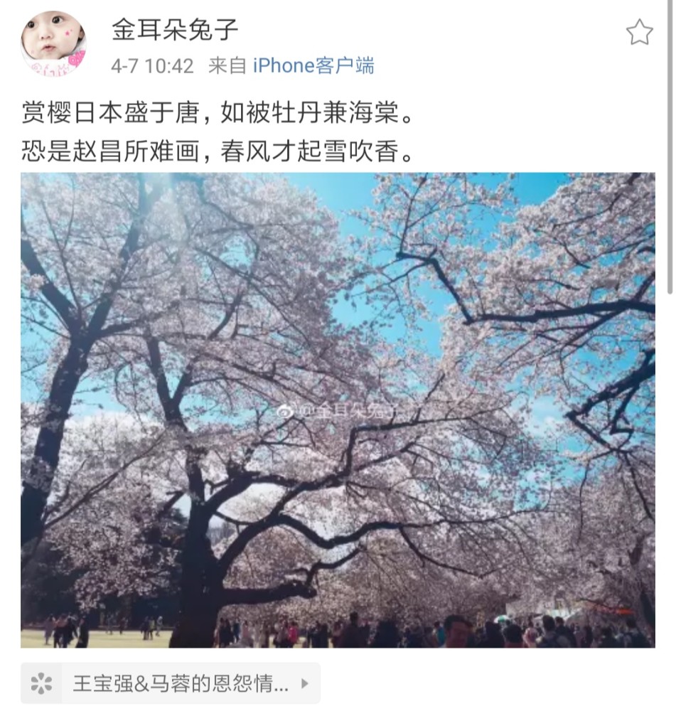 自王宝强和马蓉离婚案落幕以后,双方偃旗息鼓停战了很长一段时间。如今的王宝强依然在忙着事业,马蓉也低调了许多不再露面。4月7日,沉寂了许久的马蓉终于再次发博,去日本赏樱花,心情大好的她还用了一首诗来表达开心。