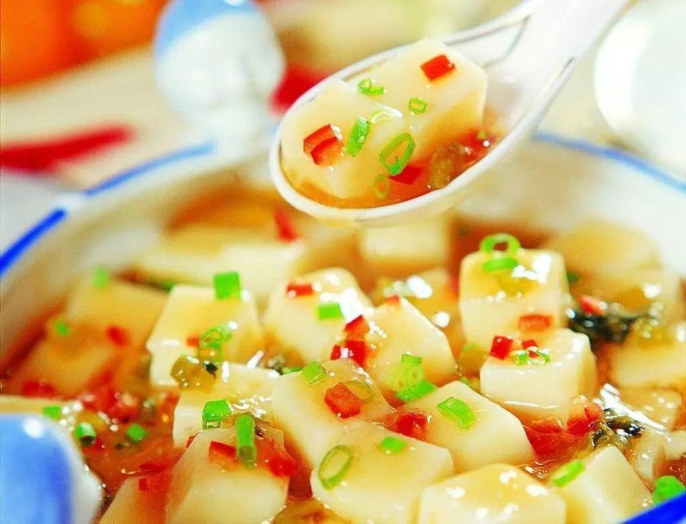 芙蓉镇的米豆腐柔柔嫩嫩的,加菜煮一碗汤,很随意,适合端着碗坐在路边吃一通。