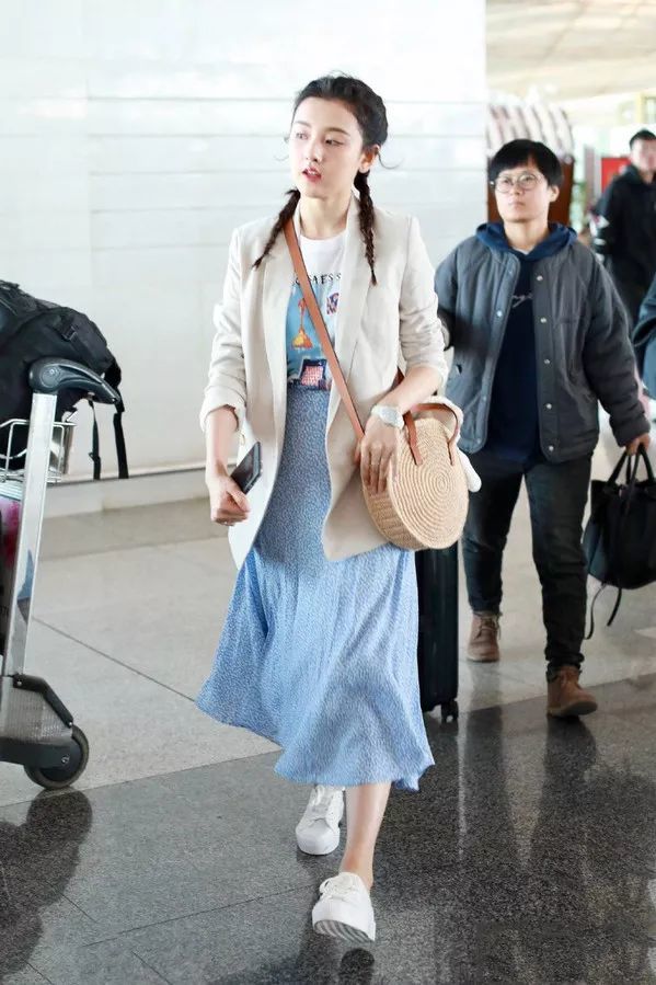 宋祖儿用蓝色半裙和小白鞋穿出了满满的休闲感,印花T恤跟两根麻花辫让海豹君隔着屏幕都能感受到满满的俏皮。斜挎着的草编包更是加强了度假感。