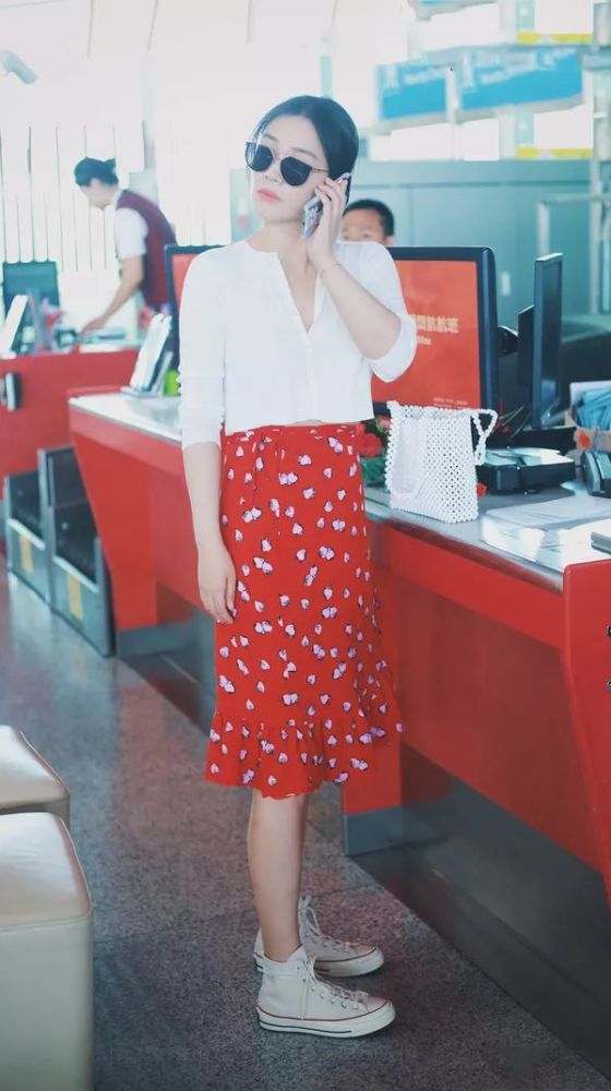 马思纯则是用明艳动人的红色碎花裙跟温柔的白色衬衫相碰撞,脚上的匡威让整个look无限接近休闲,easy chic信手拈来。