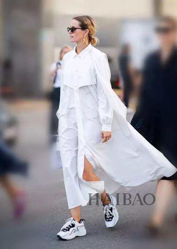 线条笔直,有点“板正”的衬衫裙,可以说是一点都不“挑”场合,不管在职场,还是出游,都不会出错,但相比girlish的高跟鞋,用休闲的运动鞋会让裙子脱离挥之不去的“办公室”感。
