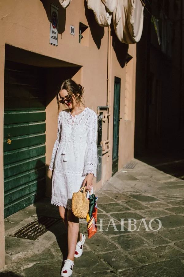 而充斥着蕾丝的100%度假风连衣裙,需要用硬朗一点的球鞋来让整个感觉不那么“腻”,打破了这种腻之后,拎着草编包也只会显得更休闲,而不是"cheap"。