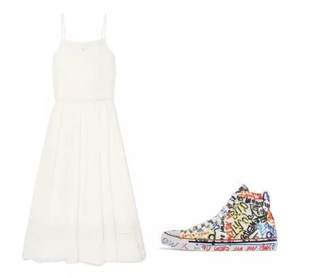 如果是设计复杂的丝缎裙,选择球鞋时一定要越简单越好,让全身有且只有一个亮点。
