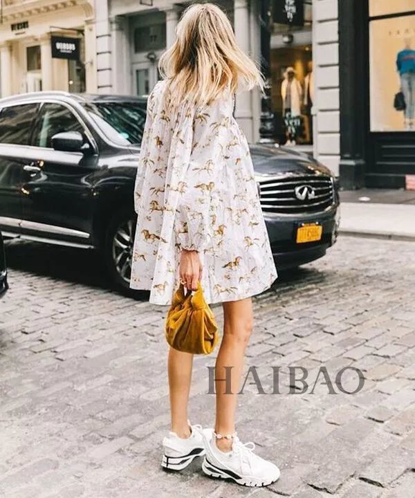 写着“风情”二字的印花连衣裙,球鞋让它年轻十岁