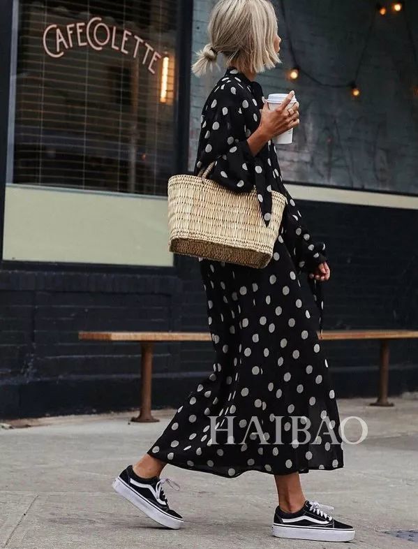 印花初阶选手可以从最简单的“全身一种花色规律排列”为第一步,像是规律排列的波点就hin不错,盛不下的French Chic一定不会出错,黑白相间的鞋子呼应了裙子的色调,但觉得太无聊的话,还可以用亮色提亮一下。