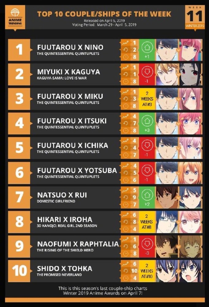近日,AnimeTrending公布了2019年1月番第11周的人气CP排行榜,我们就一起来看看上榜角色有哪些吧。第一名:《五等分的新娘》上杉风太郎×中野二乃第二名:《辉夜大小姐想让我告白~天才们的恋爱头脑战~》白银御行×四宫辉...