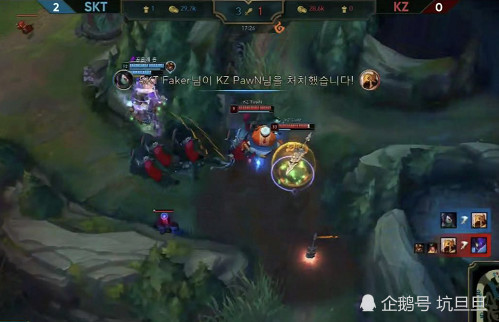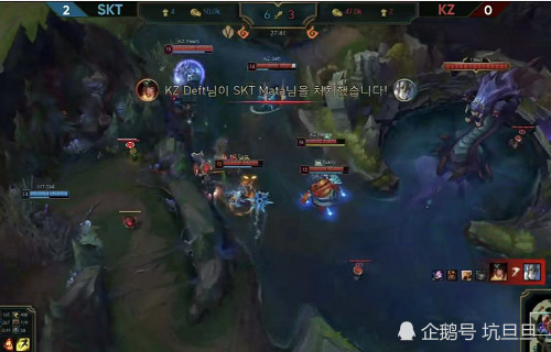 26分钟,SKT中推,阿卡丽直接强行越塔打残了塔姆,随后EZ大招收掉了这个人头。随后KZ中二塔告破,还收下了土龙。27分钟,KZ在大龙门外的草丛里埋伏到了过来做视野的阿卡丽和加里奥,最终击杀掉了加里奥。