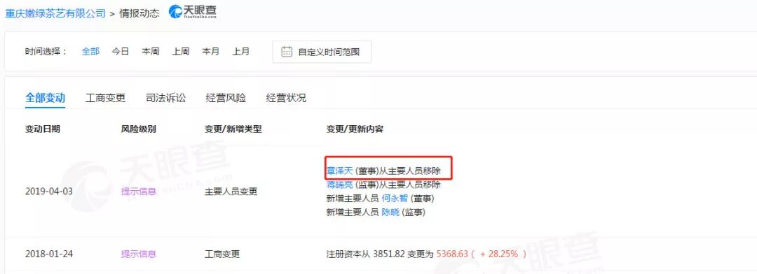 不仅如此,刘强东妻子章泽天卸任重庆嫩绿茶艺有限公司董事一职。