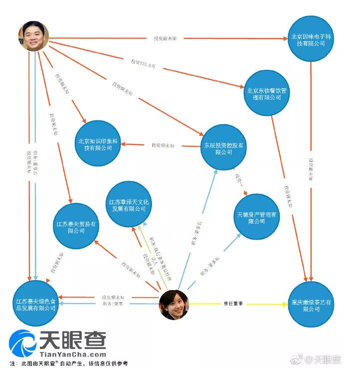 2015年,刘强东通过“北京因味电子科技有限公司”和“北京东钦餐饮管理有限公司”对重庆嫩绿茶艺有限公司间接持股,章泽天出任嫩绿茶艺董事一职。
